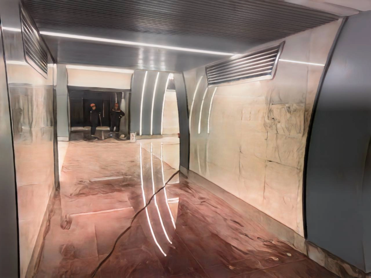 На станции закончили работы по освещению. Карнизы и арки светятся, станция наполнена светом.