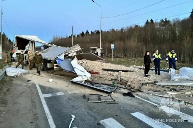 Судя по повреждениям машин, автобус «ПАЗ» протаранил прицеп фуры: у него снесена вся передняя часть, а грузовой прицеп разбит вдребезги. Кабина большегруза в целости, водитель не пострадал, но находится в шоке.