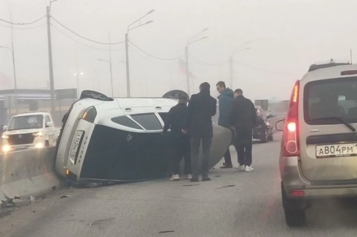 Легковой автомобиль врезался в ограждение и повалился на бок. По предварительной информации, это произошло в час пик.