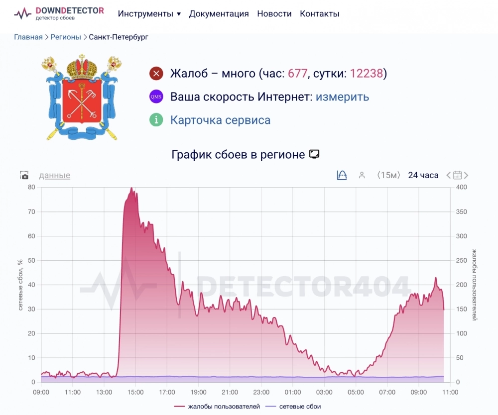 Соответствующая информация отображается на сайте сервиса DownDetector. За последний час на работу мобильного интернета пожаловались 677 раз. А за последние 24 часа жители Санкт-Петербурга оставили в общей сложности 12,2 тысяч жалоб.