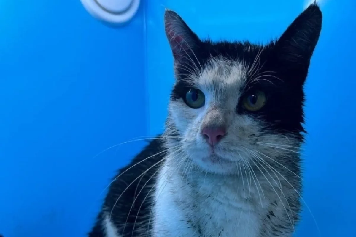 В 06:45 14 ноября в своем Telegram-канале участники спасательной операции опубликовали фото пушистого, который уже был в их руках. Это черно-белый кот, который за неделю, а может быть и больше сильно вымазался и оголодал.
