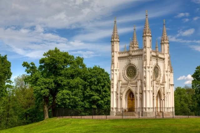 Среди зелени парка возвышается белоснежное здание с ажурными башенками и тонкими витражами – это Готическая капелла Святого Александра Невского.